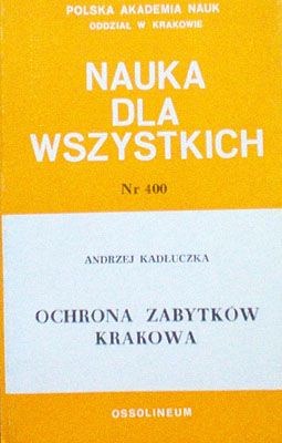 Ochrona zabytków Krakowa / Andrzej Kadłuczka. - Wrocław ; Kraków : "Ossolineum", 1986. - 41 s., [32] s.tabl. : il. ; 19 cm.