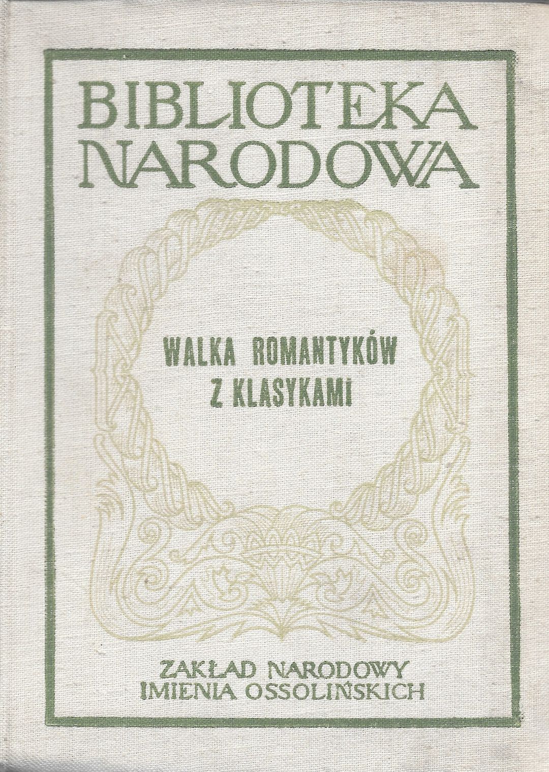 Walka romantyków z klasykami / wstęp, wypisy źródłowe i oprac. Stefan Kawyn. - Wrocław : Zakł. Nar. im. Ossolińskich, 1963 ([Kraków] : Krakowskie Zakł. Graf.). - XCI, [1], 498, [2] s. : il., portr. ; 17 cm.